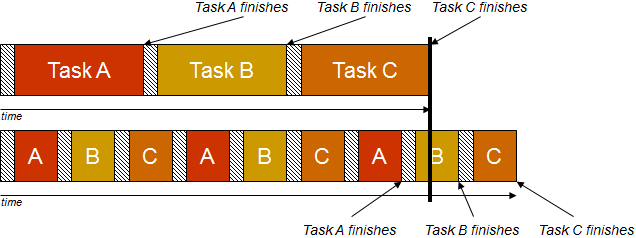 한 프로세스에서 다른 프로세스로 전환하려면 레지스터 및 메모리 맵 저장 및 로드, 다양한 테이블 및 목록 업데이트 등 관리를 수행하는 데 초당 수십 또는 수백 개의 스위치 각각에 대해 나노초 단위의 상당한 프로세서 시간이 필요하다.