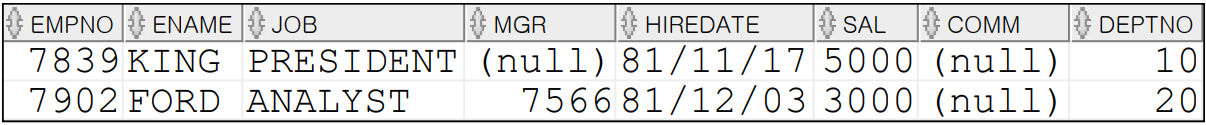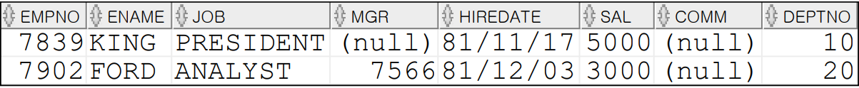 결과 >> 위의 데이터를 제외한 ANALYST, PRESIDENT 데이터만 출력