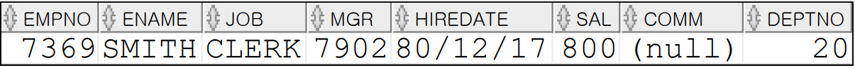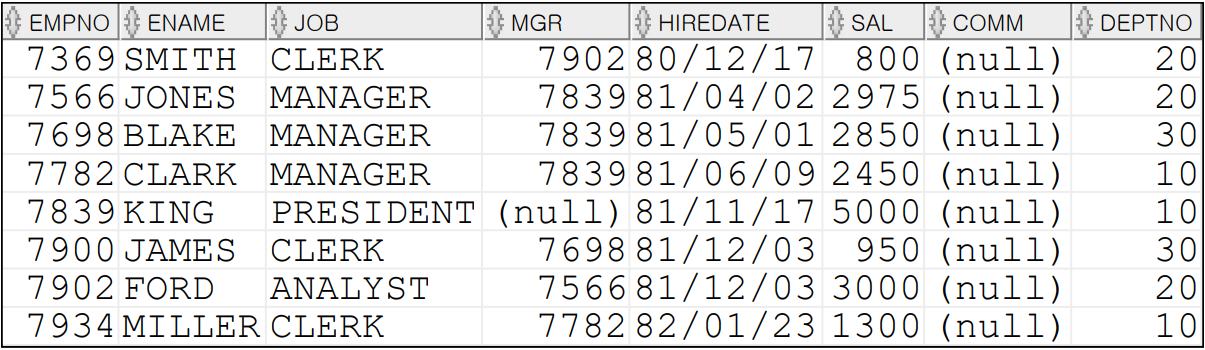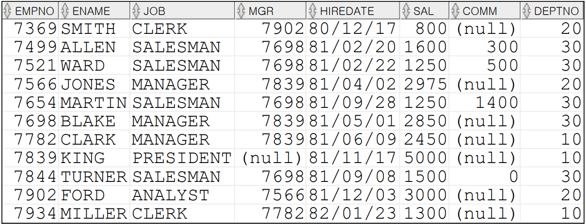 SELECT EMPNO, ENAME, SAL, DEPTNO FROM EMP