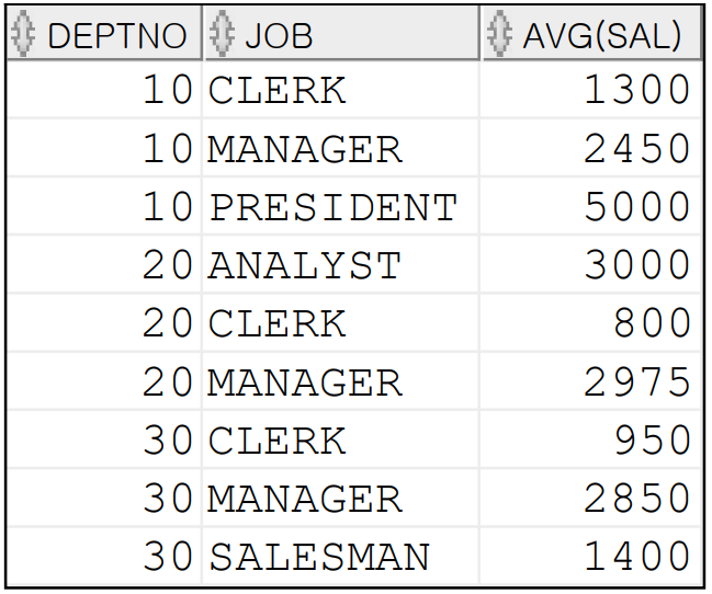 SELECT DEPTNO, JOB, AVG(SAL) FROM EMP