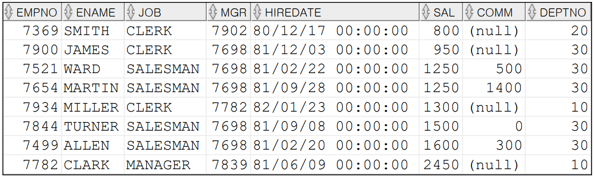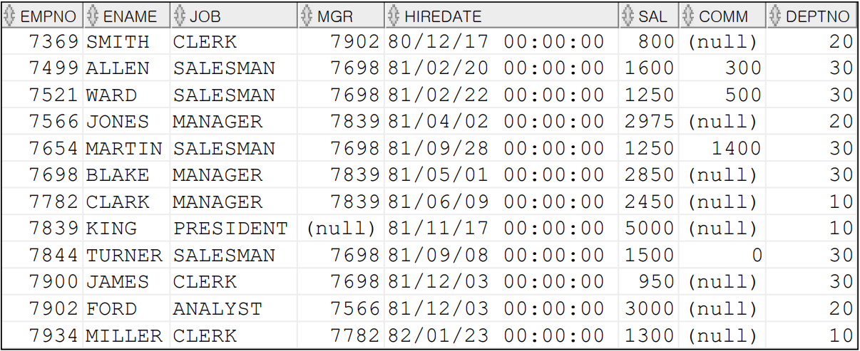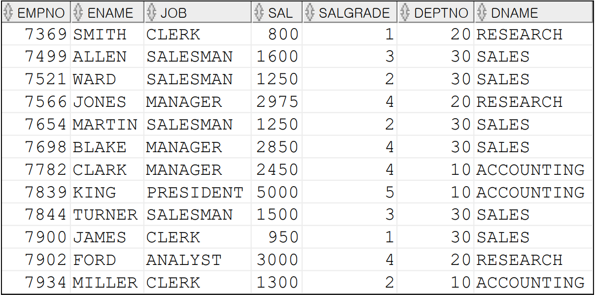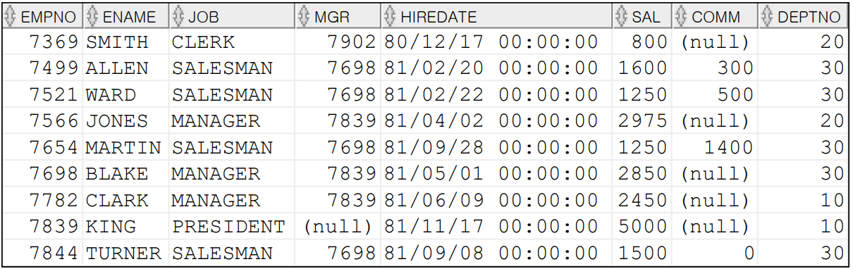 SELECT EMPNO, ENAME, JOB, SAL,