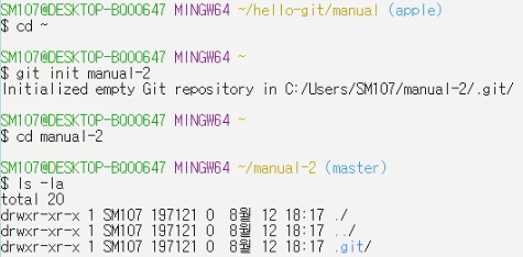 ▶ git init 다음에 디렉터리 이름을 입력하면 새로운 디렉터리를 만들고 저장소를 초기화하는 과정을 한꺼번에 처리할 수 있다.