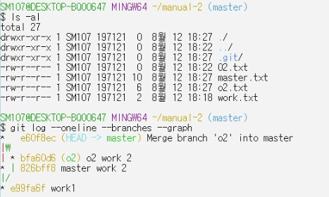 (9) ls -al 명령과 git log 명령으로 브랜치와 커밋들이 어떻게 병합되었는지 확인할 수도 있다.