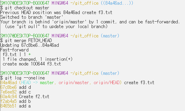 ▶ 페치한 후에 최신 커밋을 현재 브랜치에 합치려면 git pull 명령을 사용해서 원격 저장소의 소스를 내려받을 수도 있고, git merge 명령으로 FETCH_HEAD에 있던 커밋을 병합할 수도 있다. 여기에서는 git merge 명령으로 병합한다.